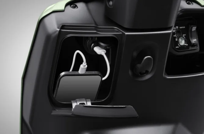 Hộc đựng đồ phía trước tích hợp cổng sạc USB giúp sạc điện thoại ngay khi di chuyển, giải quyết trực tiếp nỗi lo “hết pin giữa ca”.